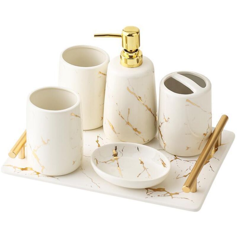 Questo set da bagno è un arredamento elegante che si adatta alla maggior parte dei bagni. Il set è composto da tutti gli accessori per il bagno di cui hai bisogno: due tazze, un portaspazzolino, una pompa per sapone, un portasapone e un vassoio. Il set è di colore bianco con motivo marmorizzato color oro. Oltre a un elegante arredamento per il bagno, questo set ti offre anche uno spazio per il bagno elegante e intelligente. Dai un tocco di classe al tuo bagno con questi accessori per il bagno! - Elegante ripostiglio per il bagno di cinque parti - Il set è composto da due tazze, un portaspazzolino, una pompa per sapone e un portasapone - Questi accessori per il bagno sono di colore bianco con motivo marmorizzato color oro - È incluso un vassoio su cui appoggiare il set Specifiche: Colore: oro bianco Materiale: ceramica, plastica Dimensioni, tazza: ca. 11 x 8 x 8 cm Dimensioni, portaspazzolino: ca. 11 x 8 x 8 cm Dimensioni, portasapone: ca. 12 x 9,5 x 3 cm Dimensioni, pompa del sapone