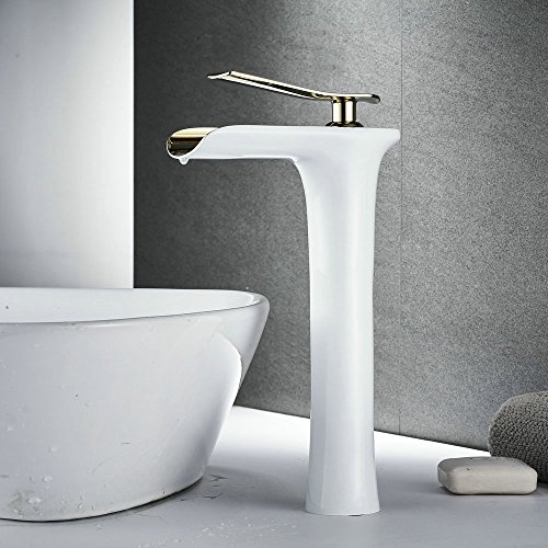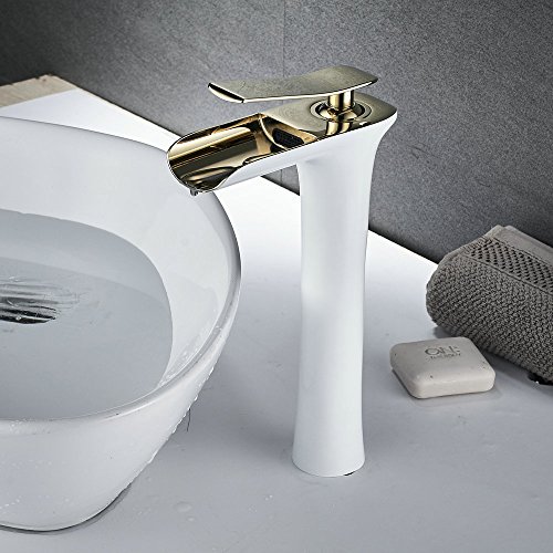 Bagno rubinetto miscelatore monoleva cascata per lavabo, oro lucido e bianco (alto)