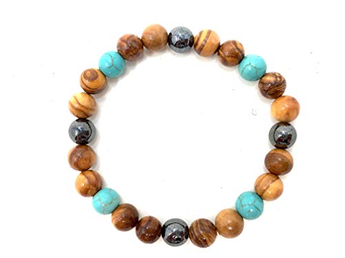 Bagusto Bracciale Realizzato con Perline in Legno d'ulivo con Gemme di Turchese realizzate a Mano su Gioielli Unici in Legno di Maiorca