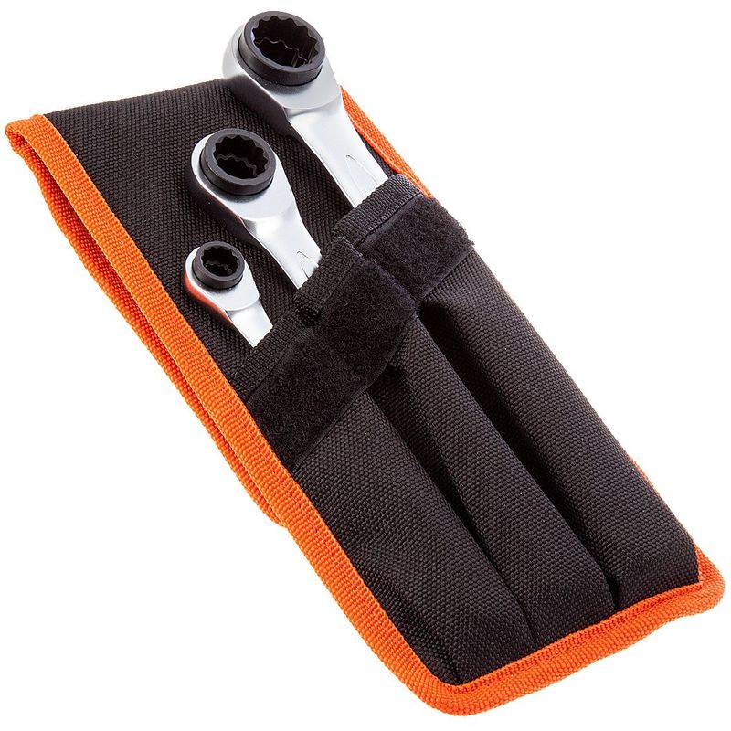 Materiale: lega di acciaio performante Numero di chiavi a cricchetto: 3 Misure: 8 x 9 x 10 x 11, 12 x 13 x 14 x 15, 16 x 17 x 18 x 19 mm Queste chiavi a cricchetto reversibili da Bahco hanno una micro finitura cromata opaca ed un profilo Testa-Dimanica a 12 punti, che riduce l'usura delle viti e dei dadi ed anche un angolo di azione di 5°. Le teste ad anello hanno una forma conica. Essendo reversibile, ciascuna delle teste della chiave ha 2 misure diverse per le due estremità ad anello. Di conseguenza, ciascuna delle chiavi ha estremità ad anello con 4 misure diverse. La consegna include 3 chiavi a cricchetto in una borsa.