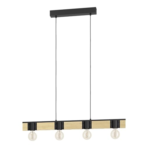 EGLO Bailrigg FSC100HB - Lampada a sospensione a 4 luci, da appendere sopra il tavolo da pranzo, con attacco E27, L 90 cm, in metallo nero e legno naturale