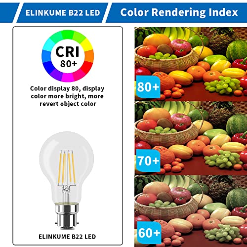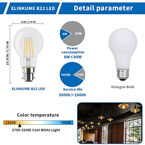 B22 LED Baionetta Lampadina,8W Bianco Calda 2700K,ELINKUME A60 Edison Risparmio Energetico Lampadine,800LM Senza Sfarfallio,Equivalente 80W Halogena Lampade,Stile Filamento Trasparente,3 Pezzi