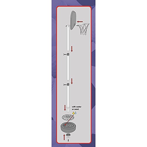 Canestro con asta regolabile può raggiungere fino ai 120 cm di altezza, la base rotonda a forma di ruota può essere riempita con sabbia o con acqua garantendo un eccellente stabilità del canestro. Realizzato in colore rosso e nero, con decorazione basket su tabella.