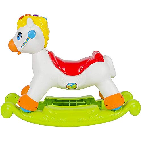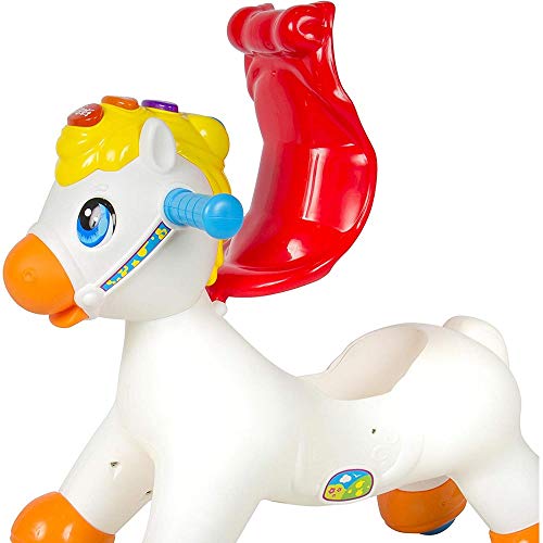 Sulla testa del cavallo sono presenti ben 3 pulsanti educativi ed un roller ogni pulsante insegnerà attraverso luci e divertenti melodie i numeri e le lettere, aiutando il bambino a sviluppare le sue capacità di apprendimento, motorie e sensoriali.