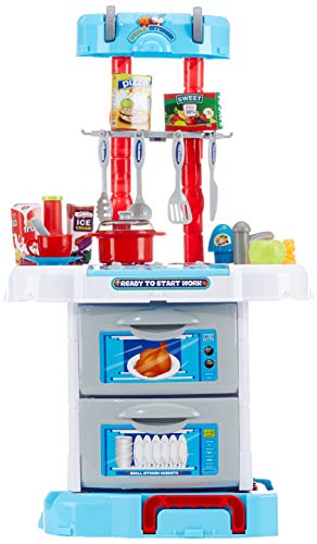 BAKAJI Cucina Giocattolo per Bambini Richiudibile a Trolley Valigetta con Fornello Funzionante, 43 Pezzi, Azzurro, 44 x 24 x 71 cm, Multicolore, 8054317258694