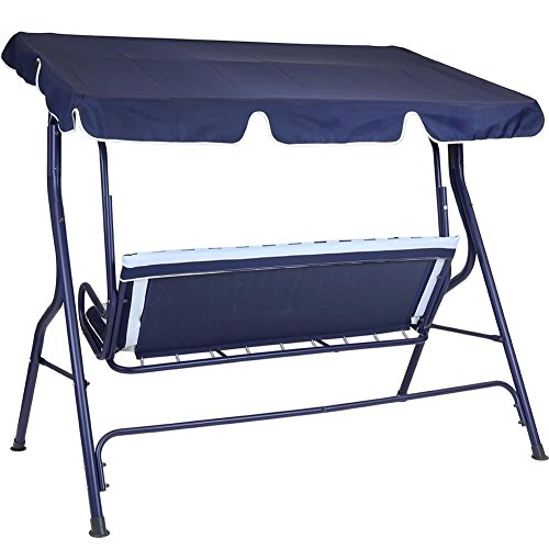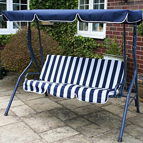 BAKAJI Dondolo da Giardino 3 Posti Altalena per Esterno Struttura in Acciaio con Tettuccio Regolabile Impermeabile Colore Blu Bianco (a Strisce), Cuscini sfoderabili