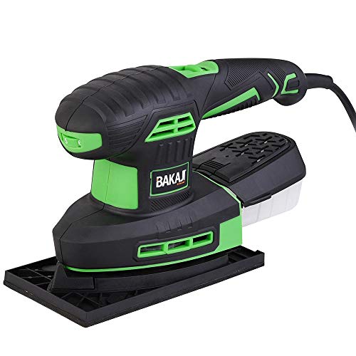 La levigatrice orbitale di Bakaji è dotata di doppia piastra una a triangolo che rende più facile l'accesso a qualsiasi angolo o punto difficile da raggiungere e una rettangolare utile sopratutto per grandi superfici.