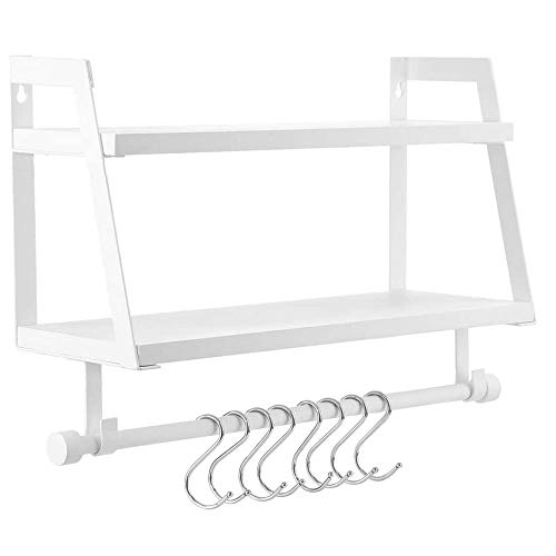 BAKAJI Mensola da Parete 2 Ripiani in Legno e Metallo Design Moderno con Asta Removibile e Ganci Scaffale Multiuso Portasciugamano Porta Rotolone Bagno Cucina 43 x 12 x 24,5 cm Bianco