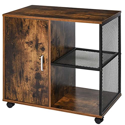 BAKAJI Mobile Mobiletto Porta Stampante Scrivania in Legno MDF e Metallo con 3 ripiani e Anta 4 Ruote Girevoli Design Moderno Industriale Arredamento Casa Ufficio Dimensione 70 x 40 x 65,5 cm