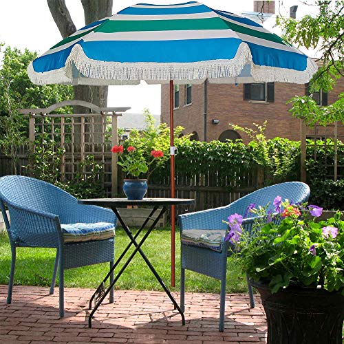 Ma ciò che rende davvero particolare questo ombrellone è il suo design dallo stile tropicale decorato con fasce Bianche e Turchesi e rifinito lungo i bordi con delle bellissime frange bianche, ma il vero particolare è il palo decorato con un bellissimo effetto legno che da proprio l'idea di essere un ombrellone proveniente dalle tipiche spiagge dei tropici.