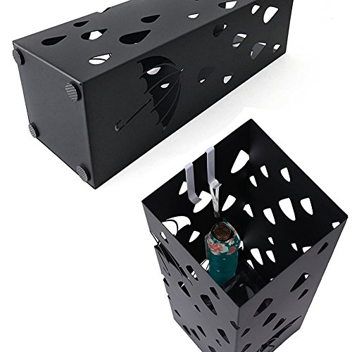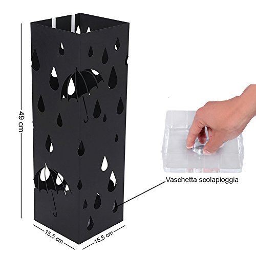BAKAJI Portaombrelli Stand in Ferro Design Porta Ombrelli Forma Quadrata Colore Nero con Decorazione Intarsio Ombrelli e Gocce Vaschetta Salvagoccia e Ganci Ombrelli Pieghevoli - 49 x 15 x 15 cm