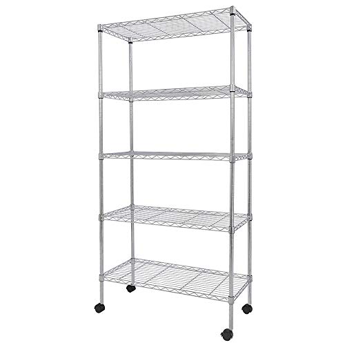 BAKAJI Scaffalatura Mobile Libreria Scaffale Multiuso in Acciaio Inox Cromato 5 Ripiani Regolabili con Ruote Dimensione 75 x 35 x 155 cm