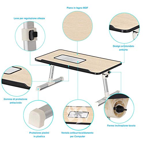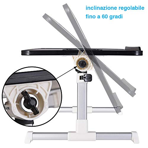 Bakaji Tavolino Vassoio da Letto Divano Supporto per Notebook PC Laptop Tablet con Ventola USB Struttura Alluminio Piano in Legno Pieghevole Altezza e Inclinazione Regolabile (60 x 30 x 27 cm)