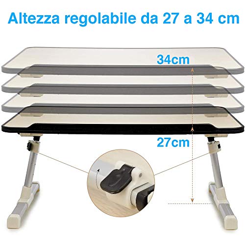 Il piano di lavoro del tavolino Bakaji è completamente reclinabile fino a 60° inoltre può essere regolato in ben 4 altezze diverse che vanno dai 27 ai 34 cm, permettendoti di regolare completamente il tavolino secondo le tue esigenze e alla posizione in cui stai lavorando.