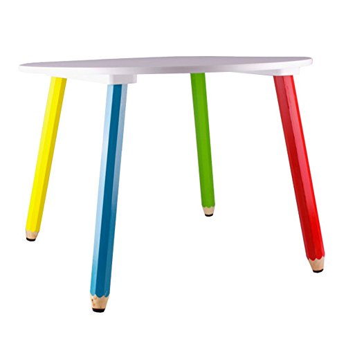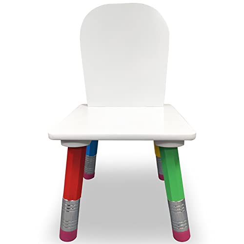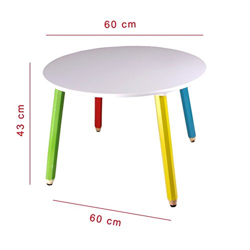 Realizzato interamente in legno Mdf con piano di lavoro e sedute in colore bianco, mentre le gambe dell'intero set sono realizzate con delle bellissime matite colorate con colori vivaci e divertenti.