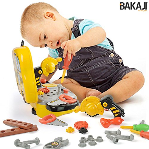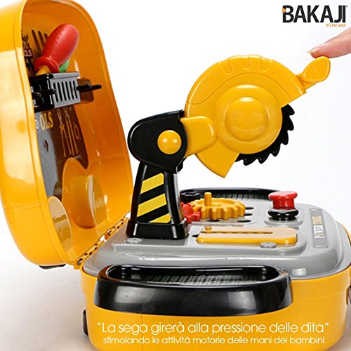 BAKAJI Valigetta Attrezzi per Bambini Giocattolo con Accessori Fai da Te Portatile 29 Pezzi, con Sega Tagliatrice ad Effetti Reali