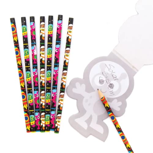 Incluso nella confezione: 12 matite a tema dello spazio profondo in 4 disegni colorati che mostrano alieni, astronauti, navi spaziali e razzi. Dimensioni della matita di circa 18 cm (7 pollici).