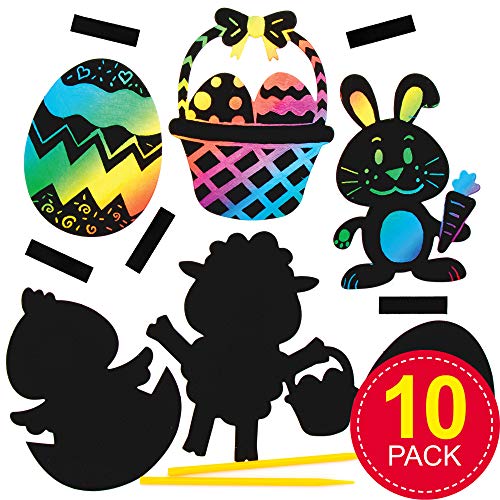 Incluso nella Confezione: Ogni Confezione contiene forme da Grattare, strumenti da Grattare e magneti autoAdesivi. 5 disegni pasquali assortiti: pulcino, coniglietto, uovo, cestino e agnello. Misura 10,5cm-13,5cm (4,1-5,3pollici). Ogni decorazione ha una superficie appositamente rivestita che può essere graffiata per rivelare i colori dell'arcobaleno.