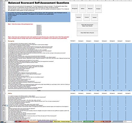 Balanced Scorecard Self-Assessment ensures you don't miss anything: More than 630 critical Balanced Scorecard success criteria in 7 RDMAICS (Recognize, Define, Measure, Analyze, Improve, Control and Sustain) steps with easy and quick navigating and answering for one or multiple participants