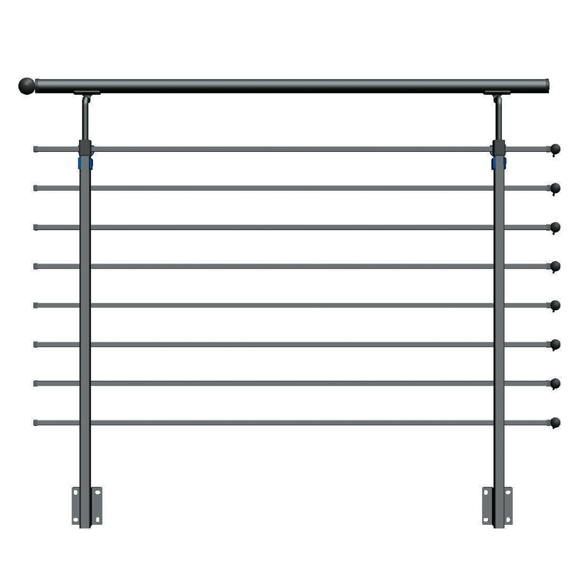Contiene tutto il necessario per realizzare moduli di 150 cm di lunghezza con relativi fissaggi e giunti con regolabilità fra 90° e 270°. Uso interno ed esterno. Installazione possibile in piano, come balaustra di un balcone, oppure in pendenza, come parapetto/ringhiera di una scala esistente. Fissaggio laterale.. Altezza ringhiera regolabile fra 100 e 110 cm tramite il fissaggio del corrimano al paletto.. Facilmente modificabile in lunghezza tramite il taglio durante la posa in opera dei tubi paralleli di collegamento e del corrimano.. Per rendere la ringhiera non scalabile da parte dei bambini è acquistabile separatamente un pannello di protezione in plexi antiurto.