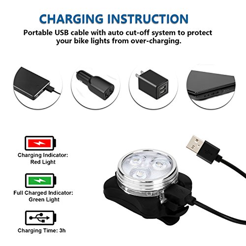 Batteria ricaricabile USB durevole - La batteria al litio integrata da 400 mAh rende queste luci LED per bici super luminose al buio. Completamente carico in 3 ore e della durata di oltre 6 ore, che consente di evitare la sostituzione inutile della batteria per sempre. Possono essere ricaricati con qualsiasi dispositivo dotato di porte USB (PC / caricatore portatile / caricabatterie da parete / ecc.) E includono la protezione da sovraccarico. Assolutamente le migliori luci per bici USB per gli a