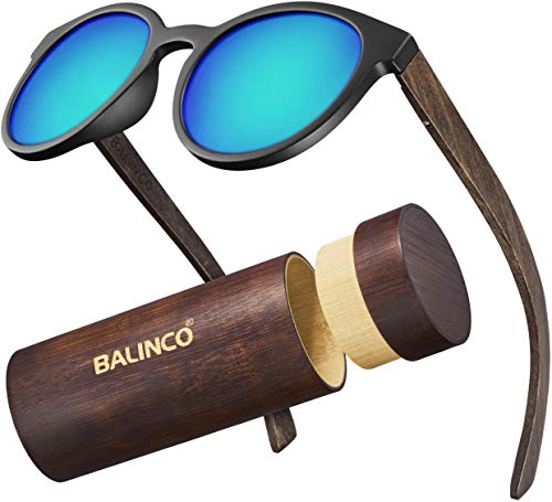 BALINCO Occhiali da sole Bamboo con lenti polarizzate rotonde in un pratico set di accessori confezione regalo protezione UV400 e TAC adatti a uomini donne blu ghiaccio specchiato