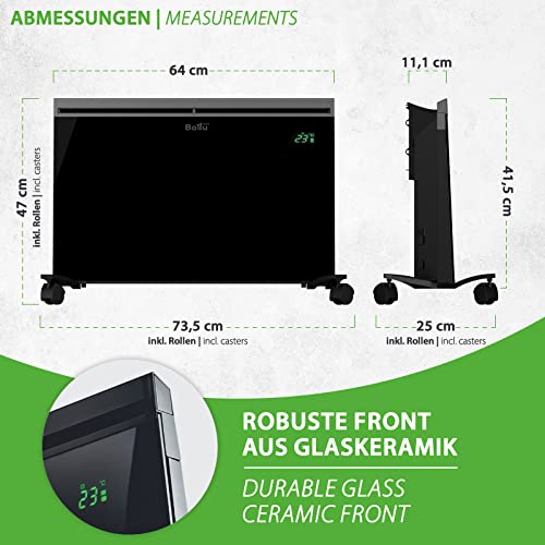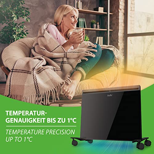 Ballu Plaza - Riscaldamento a convettore elettrico, 1500 W, termoconvettore in vetro, riscaldamento elettrico da parete su ruote, programma settimanale, timer elettrico, convettore
