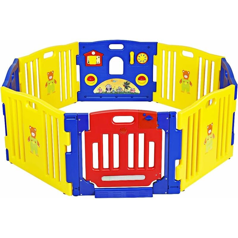 INFORMAZIONI Design Sicuro: Il nostro box per bambini è realizzato in PE sicuro e durevole che non danneggia la salute del bambino. Le ventose in gomma nella parte inferiore del pannello non lo fanno ribaltare né spostare facilmente. La chiusura di sicurezza e l'altezza di 63 cm di ogni pannello evitano che i bambini escano dal cancello. Pannello con Giochi: I giocattoli sul pannello non sono solo interessanti ma anche educativi e i bambini potranno imparare ed esplorare. Questi giocattoli promuovono lo sviluppo cerebrale, la cognizione visiva ed esercitano la coordinazione delle mani e dei piedi. Forma Flessibile: Il nostro cancello per bambini è formato da 8 pannelli che puoi combinare come preferisci. Può avere una forma circolare, quadrata, rettangolare, esagonale o ottagonale e creare uno spazio di diverse dimensioni e forme per far giocare i bambini. Ampia Copertura: Gli 8 pannelli creano un ampio spazio per i bambini. Potranno arrampicarsi o camminare, imparare a gattonare e a