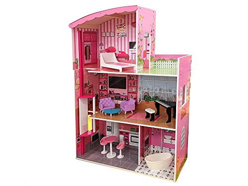 Ore e ore di divertimento assicurato: questa elegante casa delle bambole in nero e rosa, con i suoi 3 piani, con 4 stanze e una veranda. Con ASCENSORE con movimento sali scendi, rappresenta il sogno di ogni bambina. Alto 111 cm, il set da gioco è fabbricato con legno di alta qualità