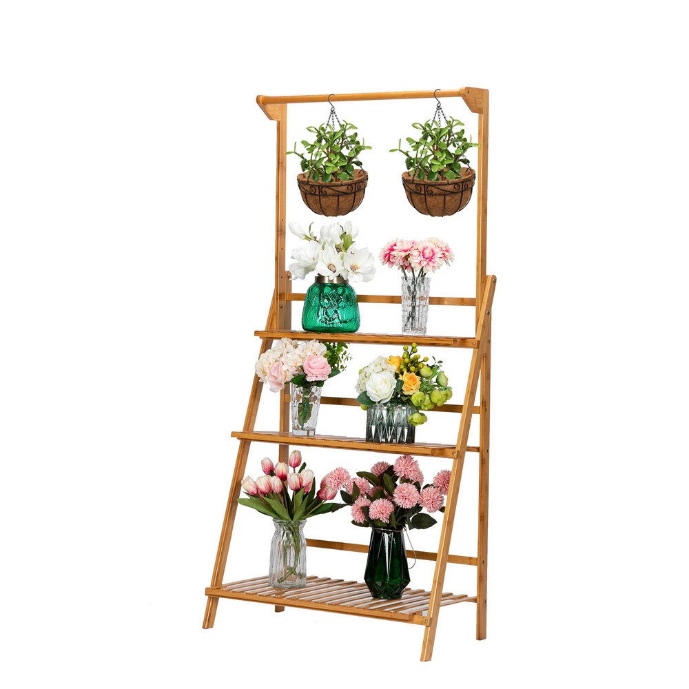 100% Bamboo Plant Frame Three Layers Balcony Bamboo Frame Folding with Hanging Rod Flower Frame Plant Stand Flower Pot Holder