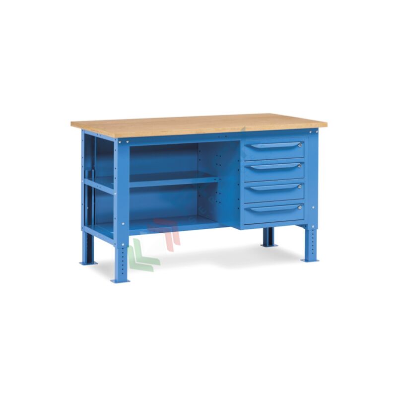 BANCO DA LAVORO GAMBE REGOLABILI CON PIANO IN LEGNO, 150 CM Banco da lavoro in acciaio, realizzato con piano in multiplex 30 mm, Mis. 1500 L x 750 P x 740/1110 H mm, con gambe regolabili in altezza. Carico massimo del prodotto 1000 Kg. Fornito smontato. L'altezza del banco da lavoro con piano in multiplex può essere facilmente variata meccanicamente per regolare il piano di lavoro non solo in base alle lavorazioni da effettuare, ma anche secondo l'altezza dell'operatore. Il banco con piano in legno è una soluzione ideale per effettuare operazioni pesanti. Nella parte inferiore del banco sono installati un armadio a cassetti con 4 cassetti e due semipiani per disporre di spazi di dimensioni diverse per lo stoccaggio del materiale. Colore lamiera in acciaio blu RAL 5012. Caratteristiche tecniche: DIMENSIONI: Larghezza: 1500 mm / Profondità: 750 mm / Altezza: 740/1110 mm PORTATA: Carico massimo del prodotto: 1000 kg MATERIALE: Lamiera in acciaio verniciato blu RAL 5012. TIPOLOGIA