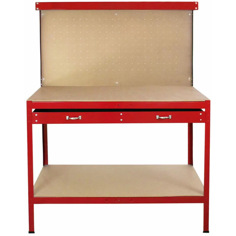 Banco da Lavoro Banco da Lavoro Porta Attrezzi 120 cm in Acciaio con Parete e Cassetto Rosso Serve aiuto con il tuo prossimo progetto? Sistema comodamente tutti i tuoi attrezzi sul pannello con i 40 ganci inclusi GRATIS. L'ampio cassetto ha una capacità di 40kg per immagazzinare tutto il materiale necessario. In aggiunta, il sistema ha una mensola in alto capace di sopportare fino a 30kg, una mensola in basso con portata di 100kg e l'area di lavoro principale tiene fino a 200kg di peso! Caratteristiche Tecniche Robusto bancone da lavoro con pannello porta attrezzi e 40 ganci inclusi GRATIS Assemblaggio semplice con design robusto capace di sopportare fino a 370kg Riponi fino a 30kg sulla mensola superiore e 100kg su quella inferiore Cassetto a piena larghezza con impressionante portata di 40kg Ripiano principale con enorme capacità di 200kg! Peso: 25kg Colore: Rosso Altezza: 155cm Profondità: 60cm Larghezza: 120cm Materiale telaio: Acciaio Materiale mensole: MDF Finitura: verniciato a