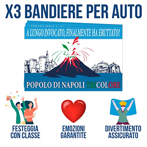 Compra per tutta la Famiglia! Set 3 di Bandiera del Popolo di Napoli per Auto - La bandiera del popolo per il popolo, città in festa, popolo di Napoli tricolore! Finalmente campione, festeggia con la bandiera Napoli Vesuvio erutta, un'idea regalo originale per tifosi d'eccezione!