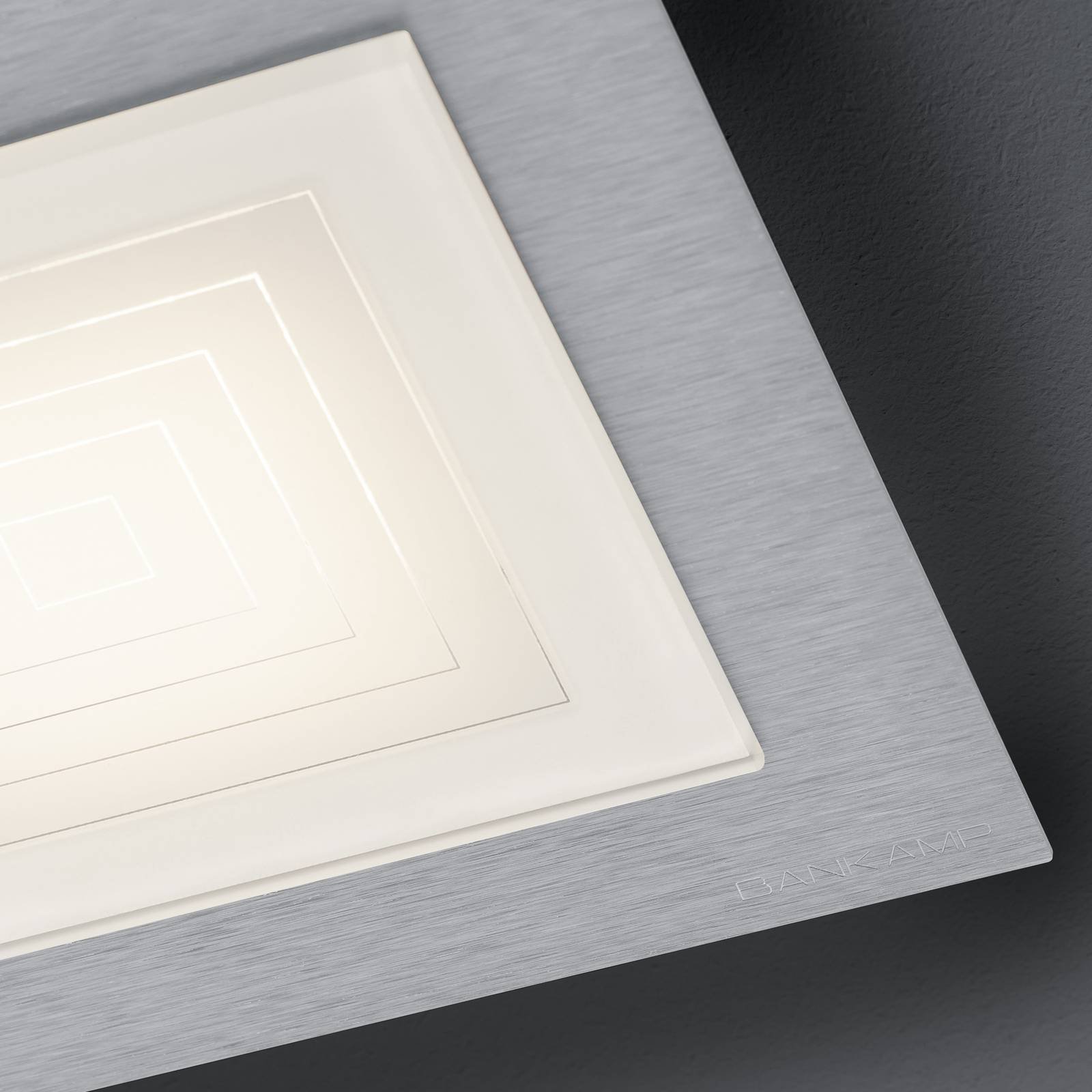 Plafoniera LED telecomandata Ino con quattro quadrati di luce strutturata in vetro opalino I dettagli scelti in modo mirato e armonioso, combinati con una forma di base semplice, fanno dell'apparecchio da soffitto Ino LED una fonte di luce elegante per soggiorni e salotti moderni. Ino è prodotto da BANKAMP in Germania nella migliore qualità possibile. Una piastra quadrata da soffitto in alluminio anodizzato forma la base. Quattro quadrati di luce sono montati in una disposizione regolare, ciascuno con una piccola distanza tra loro. Il vetro opalino diffonde la luce in modo uniforme e crea un'illuminazione generale omogenea. Una struttura di piccoli quadrati che continuano verso l'interno è lavorata nel vetro opale. Questo crea un carattere di rilievo attraente. L'apparecchio a soffitto può essere comodamente controllato con il telecomando B-Link incluso, che può essere utilizzato sia come elemento di controllo mobile che come controllo a parete. L'apparecchio può essere acceso e spento con una pressione, e dimmerato con un giro;