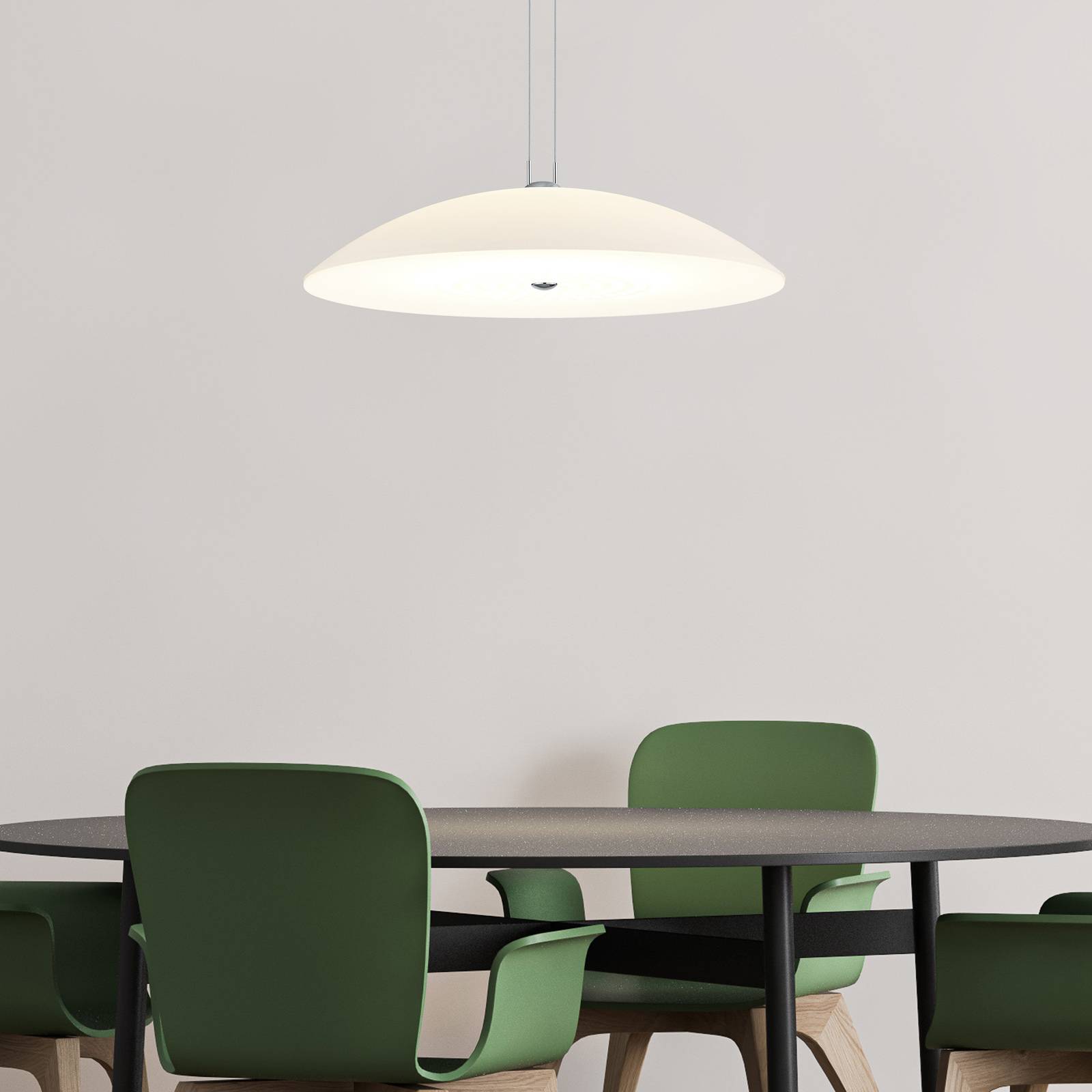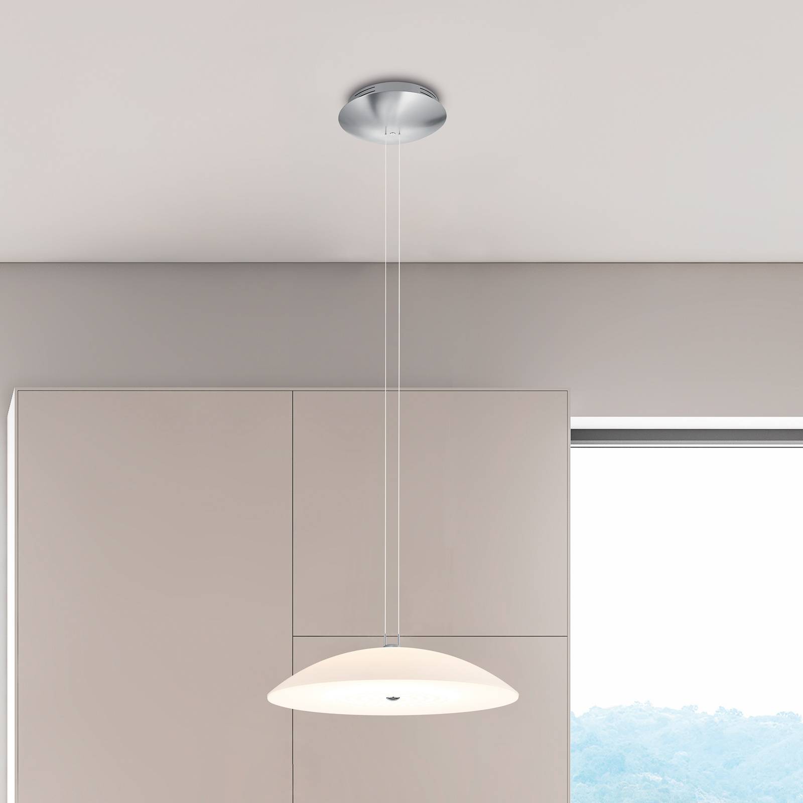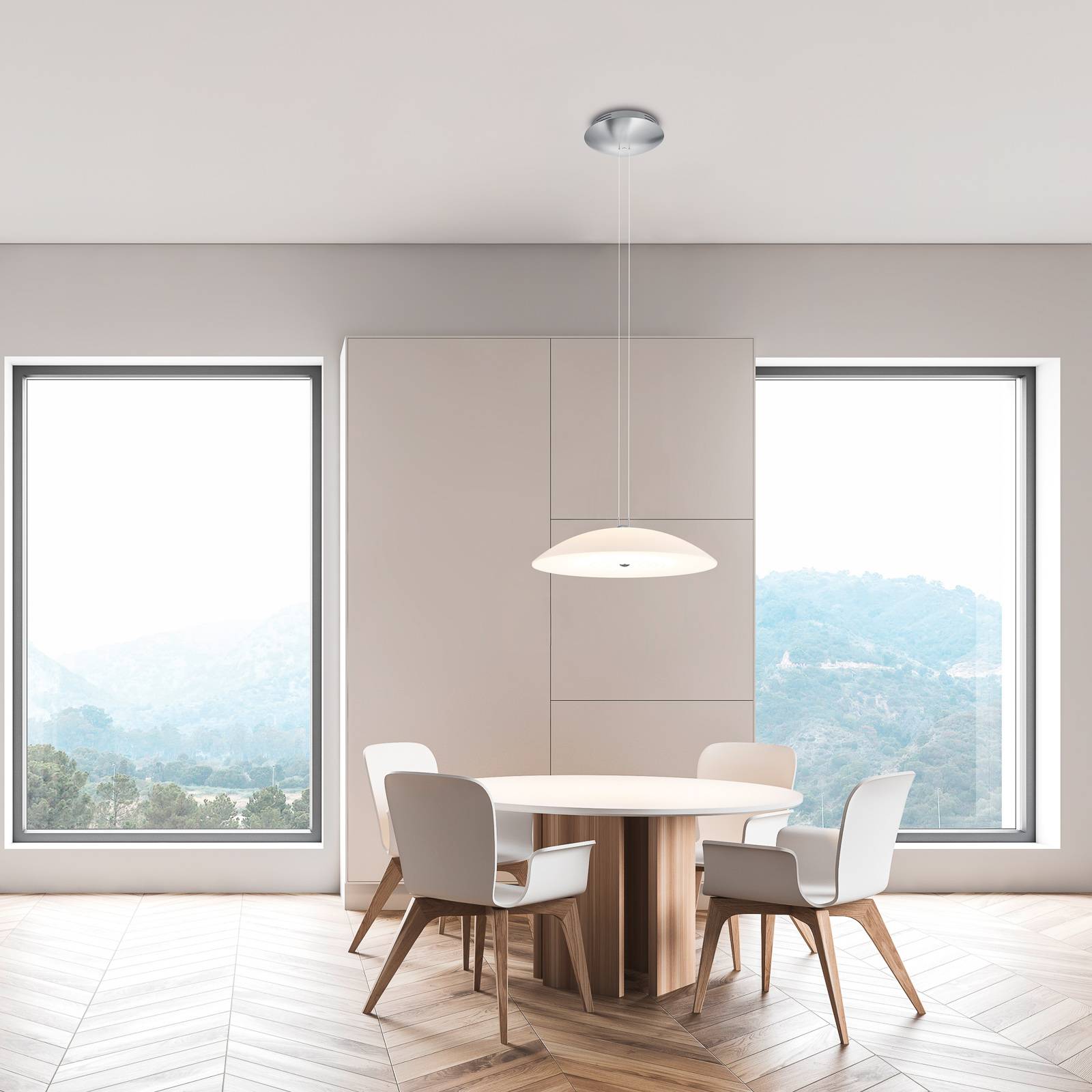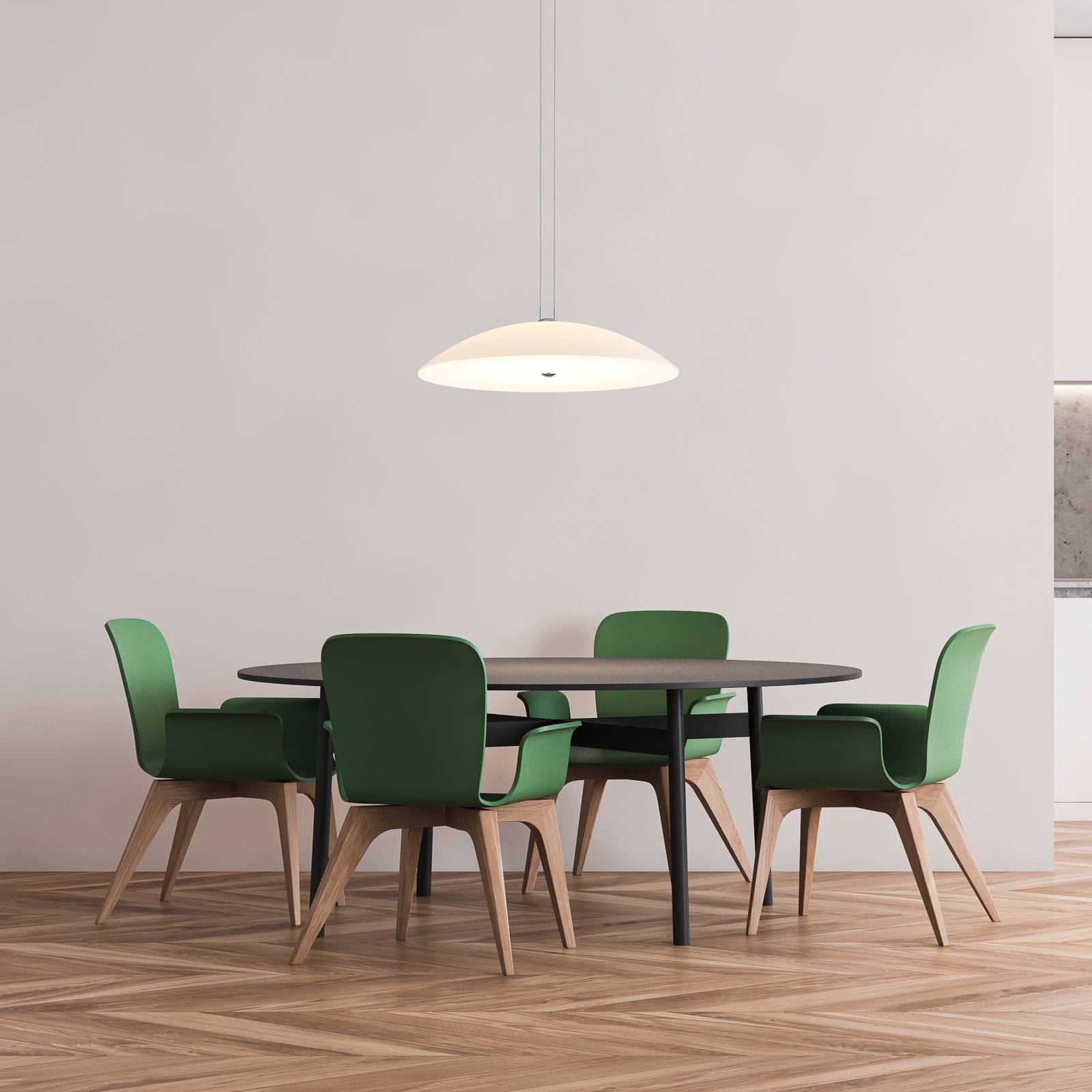 Lampada a sospensione a LED Manu - design classico e tecnologia moderna La lampada a sospensione a LED Manu si presenta in modo molto classico con il suo paralume curvo, chiuso verso il basso, in vetro bianco opale e una sospensione in metallo anodizzato. La lampada a sospensione si inserisce in ogni interno ed è perfettamente adatta all'illuminazione del tavolo. Uniforme e antiabbagliamento, la luce dei LED brilla attraverso il paralume bianco opale e illumina non solo un tavolo, ma anche la stanza in generale. La flessibilità è data dalla funzione "dimmerabile in verticale", che permette di regolare la luminosità direttamente sull'apparecchio inclinando il paralume di almeno 12°. Una volta raggiunta la luminosità desiderata durante il processo di oscuramento, essa viene fissata riportando l'ombra nella sua posizione originale. Durante l'oscuramento, la luce diventa più calda allo stesso tempo (da fioca a calda), il colore della luce cambia da 3.000 K a 2.000 K. Una funzione di memoria salva l'ultima impostazione fino alla prossima accensione. Un'altra caratteristica tecnica dell'apparecchio è il modulo ZigBee integrato. Ciò consente di integrare l'apparecchio in tutti i sistemi per la casa intelligente basati su questo standard wireless. In combinazione con i relativi accessori, l'apparecchio può essere controllato tramite app o voce. La lampada a sospensione Manu è un prodotto di qualità di BANKAMP. Il produttore di luci BANKAMP produce luci di alta qualità nella regione del Sauerland, caratterizzate da un design speciale, un'ottima fattura e un'elevata funzionalità.