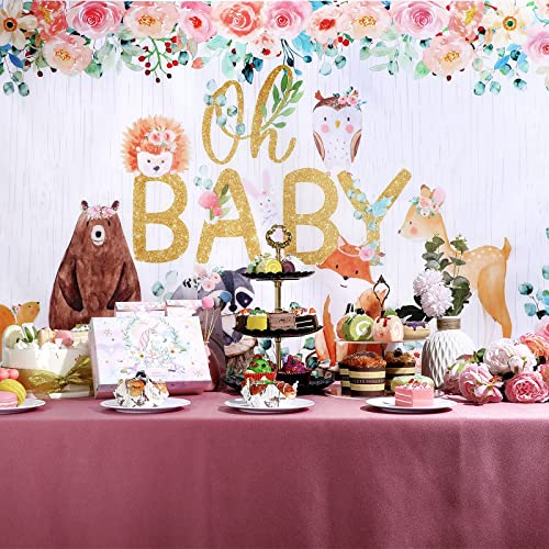 Decorazioni per baby shower con animali del bosco: adorabili animali della foresta con ghirlande, fiori, elementi in polvere d'oro stampati con lettere, l'intero tessuto di fondo è armonioso e brillante, tutto lo stile è sbilanciato verso le ragazze