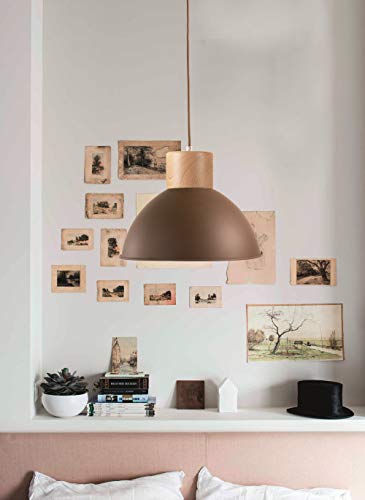 Materiale metallo e legno finitura ruggine ruvida. Diametro 39 cm. Lunghezza pendel 100 cm. Supporta lampadina a LED. Attacco E-27.
