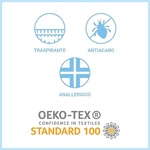 Composizione tessuto: 100% Spugna di Microfibra - Composizione strato impermeabile: membrana PU. Prodotto realizzato in conformità agli standard OEKO-TEX, CertiPUR ed EuroCELL, secondo processi ecocompatibili e in assenza di sostanze nocive.