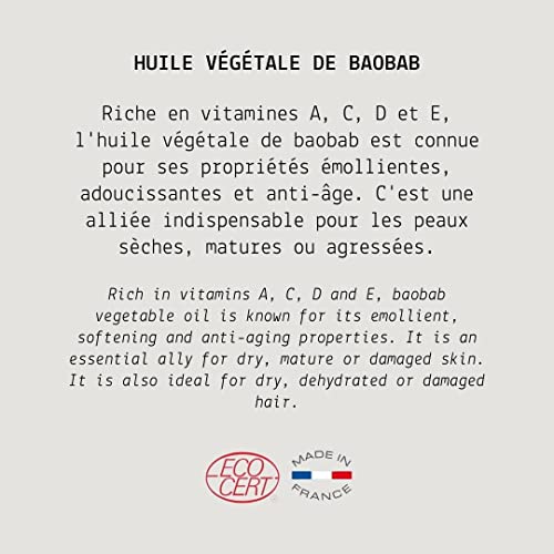 L'olio vegetale di baobab è molto ricco di vitamine A, D, E ed F, è noto per le sue proprietà nutrienti, idratanti ed emollienti. Le vitamine A e F favoriscono la rigenerazione e il rinnovamento delle cellule della pelle. La vitamina E è uno dei più potenti antiossidanti, particolarmente efficace per le cure anti-età. L'olio vegetale di baobab è un prezioso alleato per pelli secche, lacerate, screpolate o esposte al sole, al vento o al freddo.