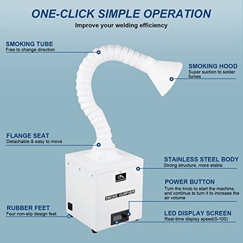 [Estrattore di saldatura ad aspirazione potente] L'affumicatore per saldature utilizza un potente vento per assorbire e filtrare i gas e le polveri nocive, e il tasso di purificazione può raggiungere il 99,97%. Questo dispositivo di affumicatura è dotato di un sistema di filtraggio a tre strati e il periodo di sostituzione è di 1-3 mesi.