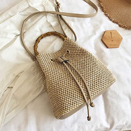 BAOZENGMUY Borsa di Paglia Borsa A Tracolla da Donna Borsa A Secchiello Intrecciata in Paglia con Coulisse Borsa da Spiaggia in Vimini con Manico in Vimini E Rattan Femminile 24X14X25 Cm Beige