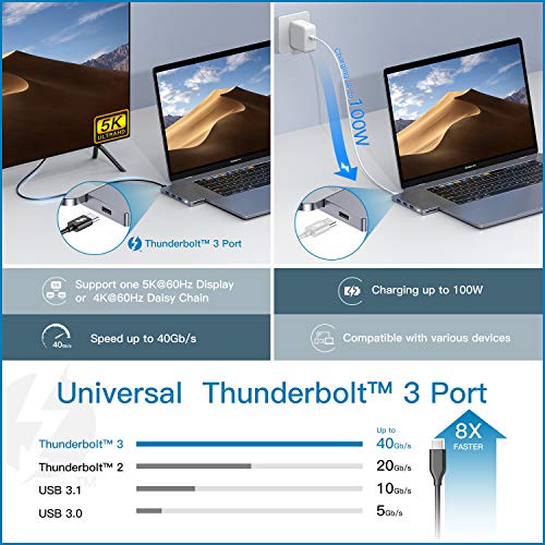 【USB C a Thunderbolt 3 Hub】: l'adattatore Thunderbolt 3 supporta i dati (40 Gbps), risoluzione fino a 5120 x 2880, uscita audio e video, fino a 100 W di alimentazione (nota: se il connettore Thunderbolt 3 viene utilizzato come uscita video, il dispositivo non può essere ricaricato contemporaneamente)