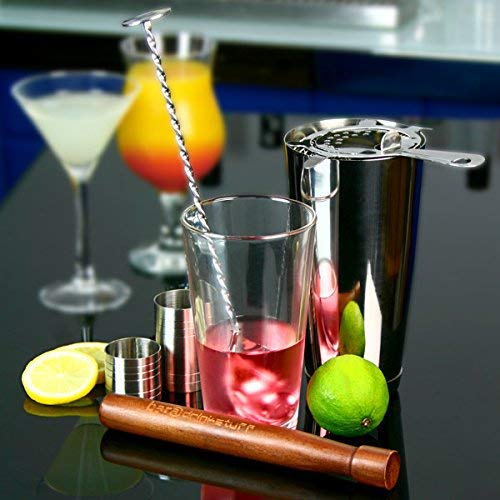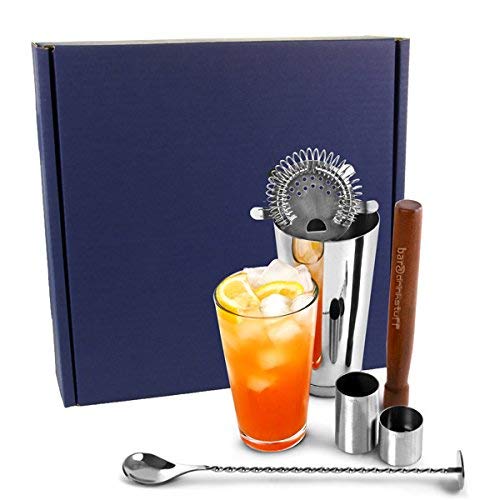 Bar@drinkstuff - Set per cocktail con libro di ricette [ lingua inglese ], in confezione regalo, con shaker americano, bicchiere in alluminio e bicchiere in vetro, strainer tipo 'Hawthorne', pestello, cucchiaio avvitato per mescolare, misurini da 25 e 50 ml