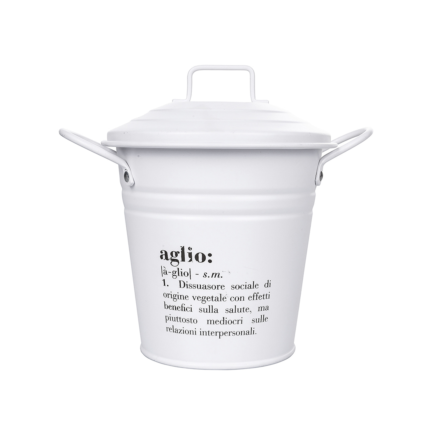 La linea Victionary, con il suo personale vocabolario, attribuisce ad accessori di uso comune un significato speciale che coniuga elementi di creatività e vita quotidiana. La definizione di aglio stampata sul lato del contenitore ti strapperà un sorriso ogni volta che lo afferri per prepararti una buona bruschetta o cucinare altre delizie. Il barattolo a forma di bidoncino è realizzato in metallo bianco con 2 fori nella parte posteriore ed è completo di tappo e doppia impugnatura. Capacità: 1 Litro. Misure: 13x13 cm.