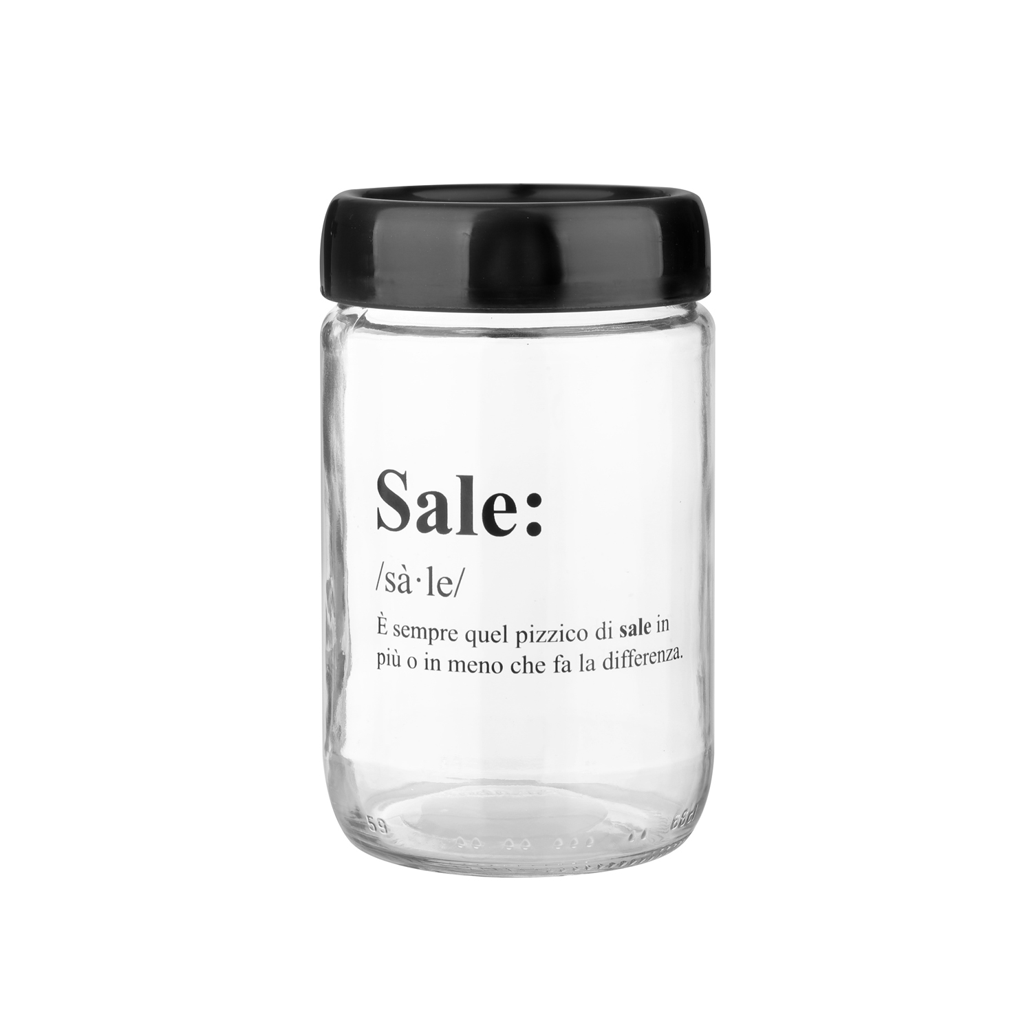 Porta in cucina un tocco di allegria con questo barattolo per il sale con frase a stampa. Il design essenziale, e il contrasto tra corpo trasparente e dettagli scuri, sono in pieno stile moderno, che unisce eleganza e un pizzico di ilarità, per vedere sempre il lato brillante della vita. Grazie alla chiusura ermetica conserva al meglio la tua scorta di sale grosso o fine in dispensa e puoi lasciarlo anche in bella vista sul piano in cucina. Capacità 660 ml.