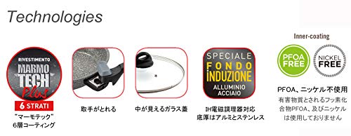 Corpo in alluminio ad altissimo spessore, che diffonde il calore in modo più uniforme, assicura un basso consumo energetico e permette un migliore ancoraggio del rivestimento antiaderente, rendendo la padella molto più duratura, made in italy