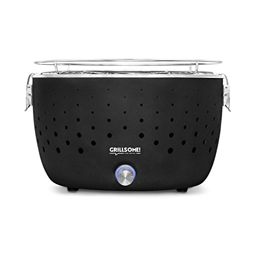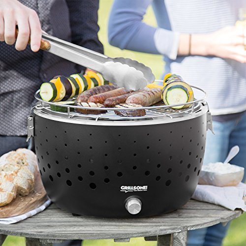 Barbecue a carbone di legna senza emissione di fumo Hugo con ventilazione attiva Barbecue portatile da tavolo o balcone in acciaio inox antracite con sistema di accensione rapida, ventola e custodia inclusa