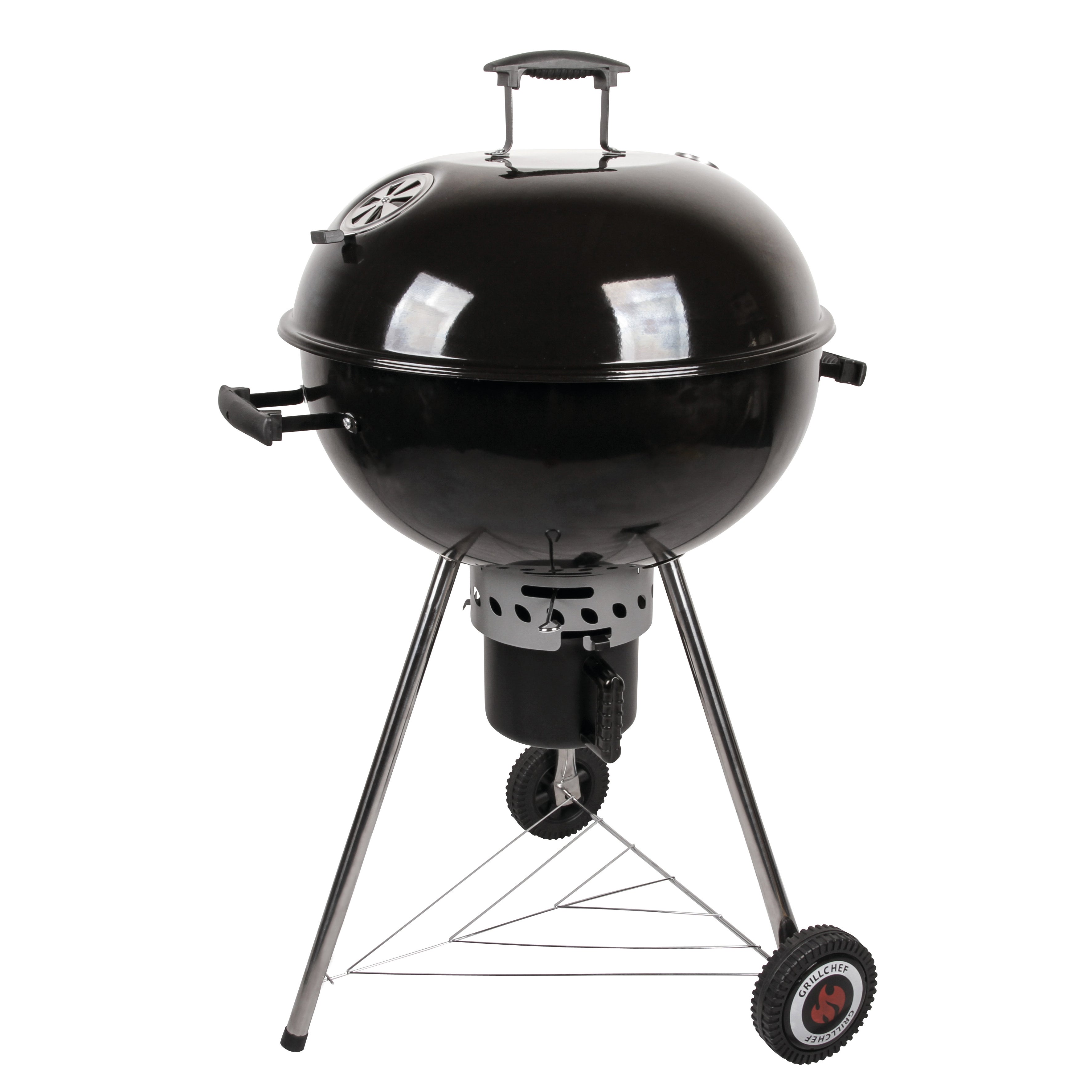 Dimensioni area di cottura ø 53 cm. Ideale per 6 persone. Indicatore di temperatura integrato nel coperchio. Coperchio e braciere a bacinella in metallo smaltato. Griglia, separatore del carbone in versione cromata. Disco di ventilazione per la regolazione dell'alimentazione dell'aria