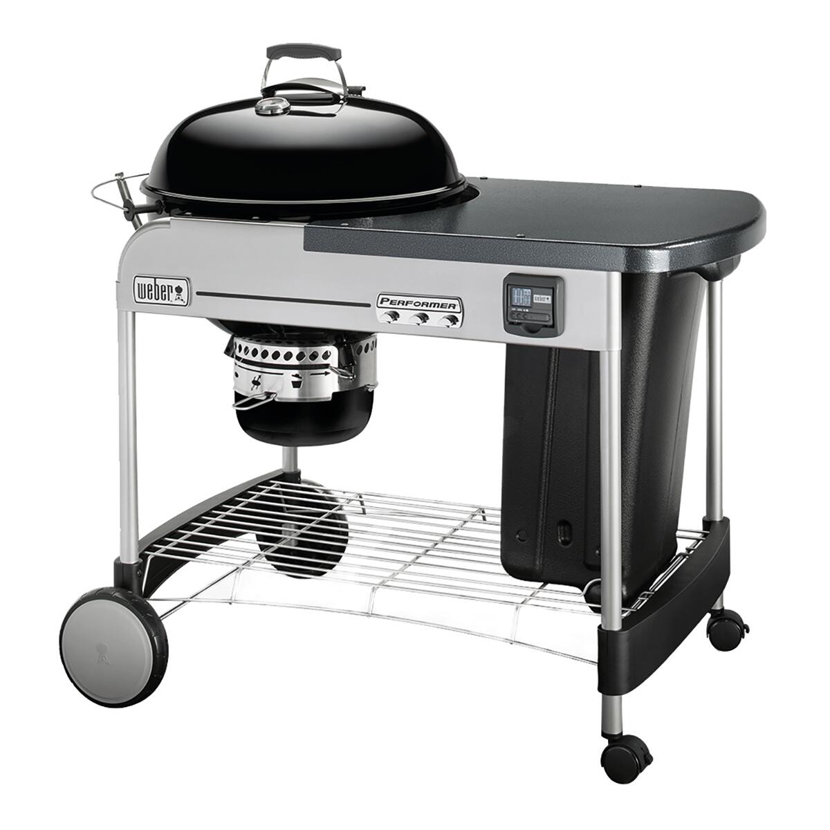 Performer Premium GBS a carbone. Include porta-utensili, supporto per il coperchio, cesto porta carbone e 2 cesti separa carbone. Adatto a 10 persone, consente diverse modalità di cottura: ideale per affumicare, arrostire, grigliare, e cuocere come in un forno. Maniglia con schermo termico, termometro integrato nel coperchio. Il carrello offre un pratico piano di lavoro, e la comodità delle ruote per facilitarne lo spostamento. Sistema di pulizia One-Touch in acciaio inox, raccoglicenere rimovibile ad alta capacità in alluminio