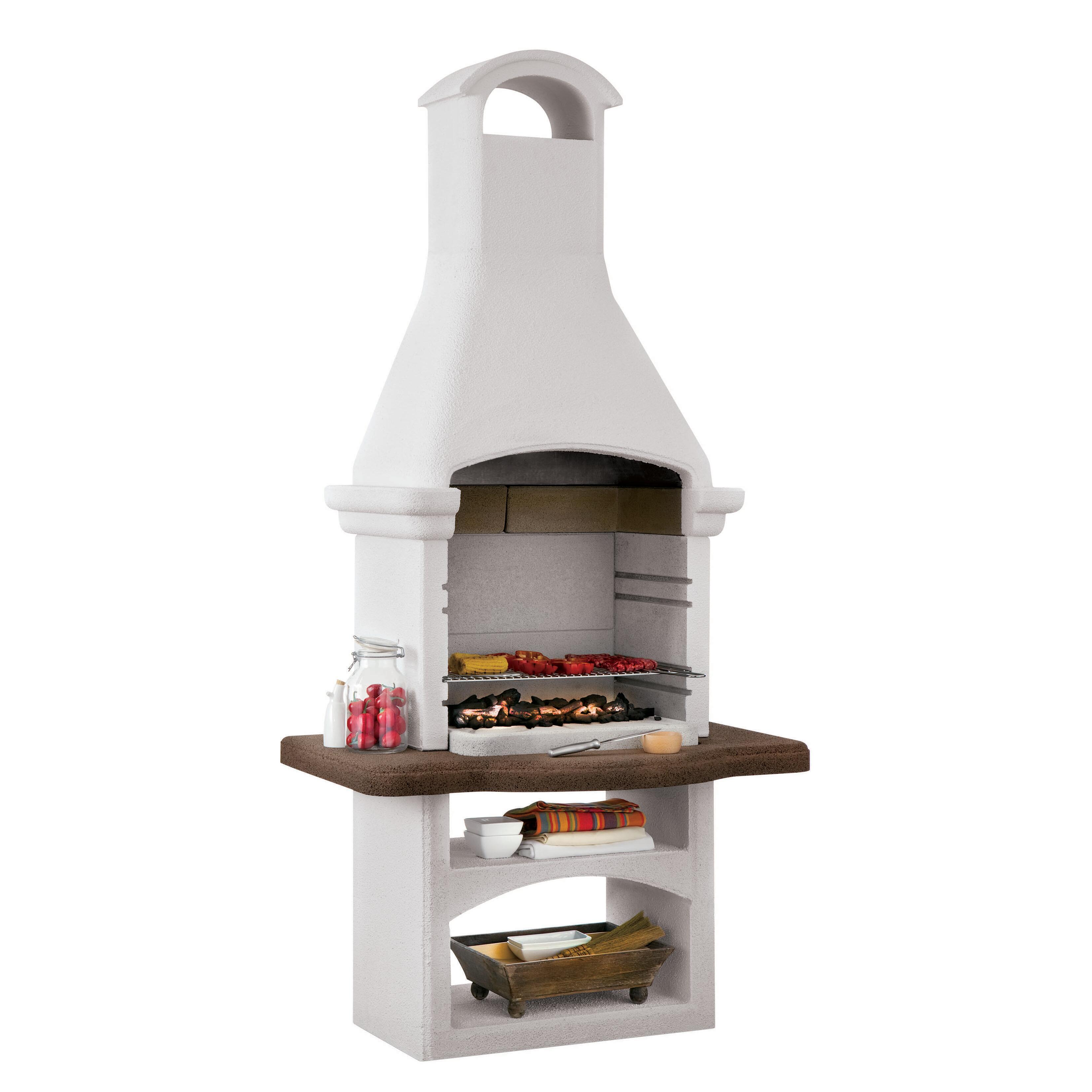 Griglia in acciaio cromato 68 x 40 cm regolabile su 4 altezze. Ideale per 12 persone. Cuoce sia a carbonella che a legna. Piano di appoggio per utensili sotto il piano di cottura, spazio per riporre le legna.